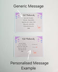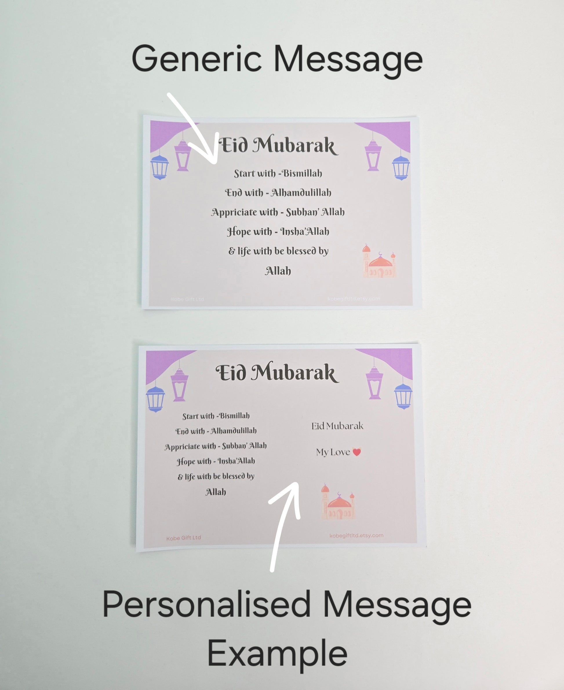 We will add the message "Start with - Bismillah, End with - Alhamdulillah, Appreciate with - Subhan Allah, Hope with - Insha'Allah & life will be blessed by Allah" to the inside back board of the box unless you request a personalised message. Then we will add the personal message to the right hand side of the inside backboard of the box. The same message will be on the left.